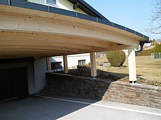 Carport Holzkonstruktion mit Metallsäulen und waagrechter Wandverschalung